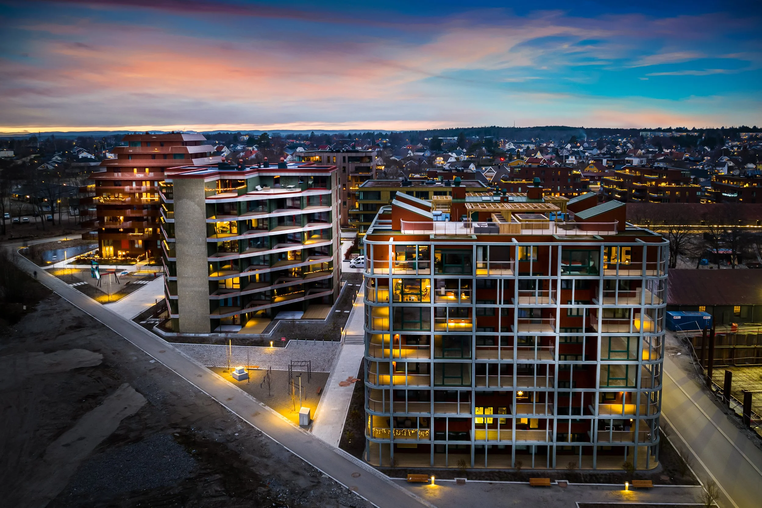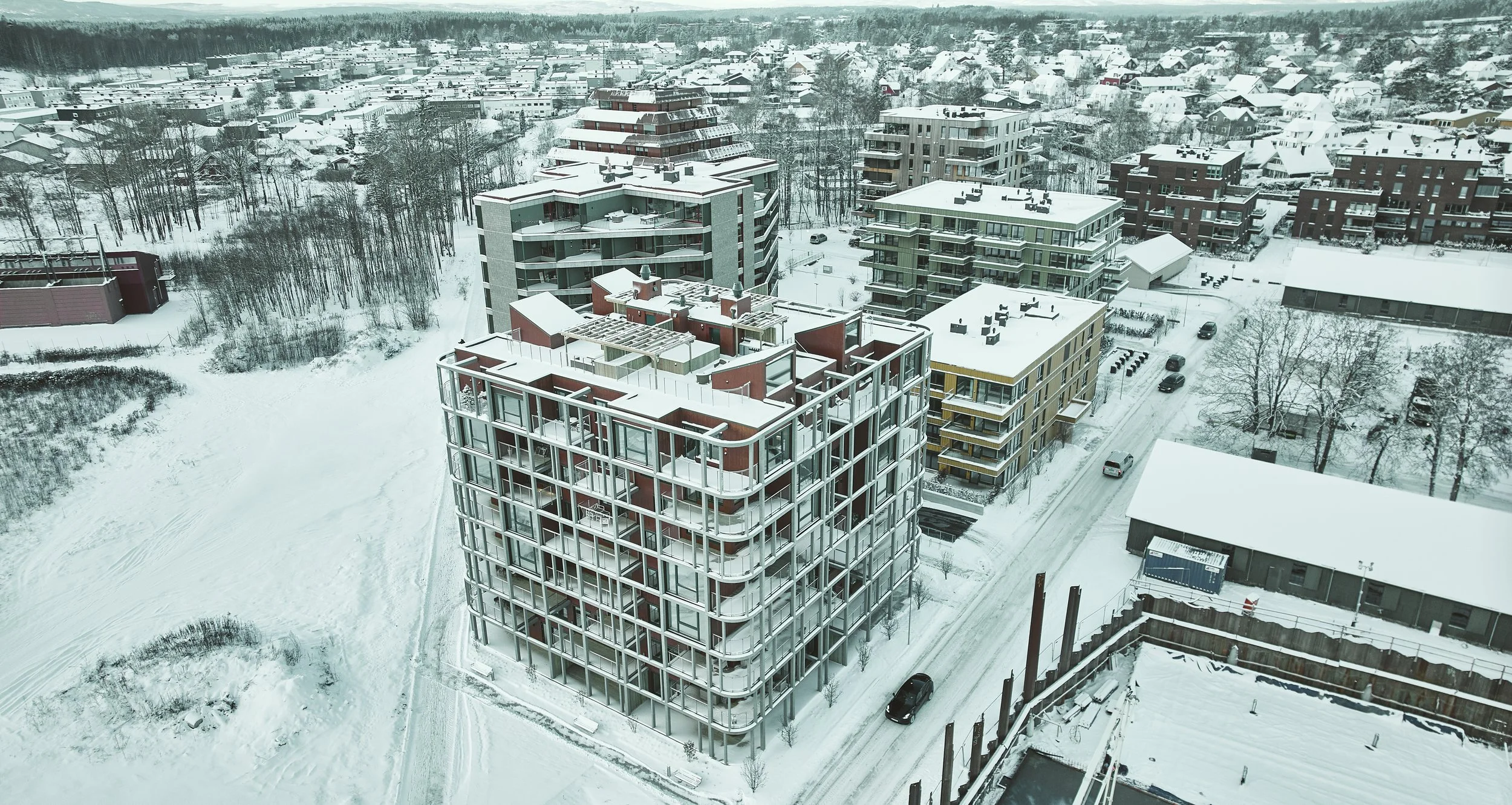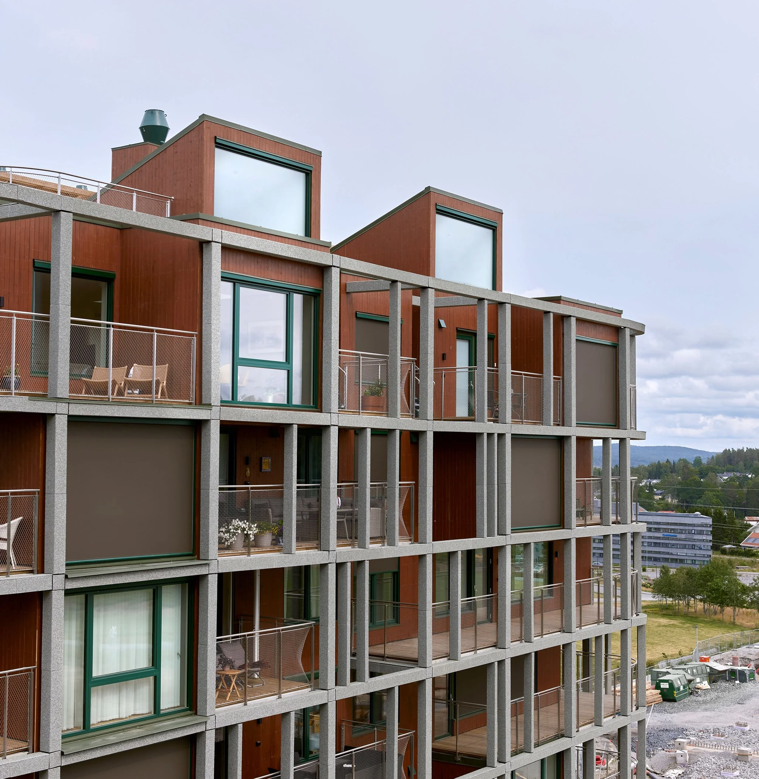 Ski Tower is one of four high-rises that will make up a new neighborhood called Magasinparken in Ski outside of Oslo. This building stands out because of its exterior framework that wraps around it and gives the structure an organic and mellow look with no obvious front- or backside. This exoskeleton allows a space between the façade and the framework where private balconies have been put in. The framework is made from crushed olivine, which has a natural ability of binding CO2 and cleansing the air. The seemingly asymmetrical composition of the framework is in itself a decorative element that prevents the inside of the apartments from being visible from the outside.