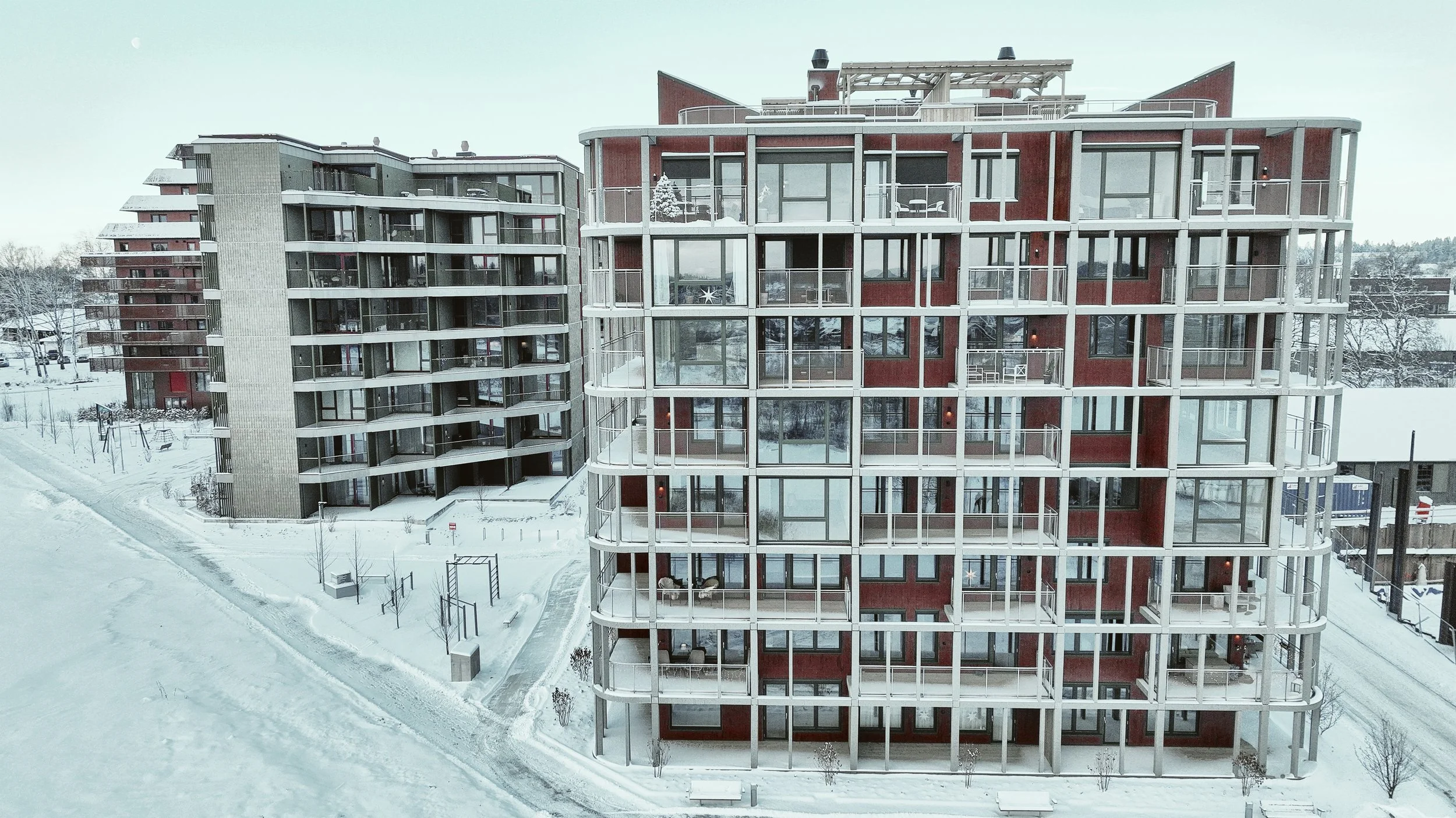 It was important for us to establish an interaction between the four high-rises on this plot. The rounded corners of Ski Tower gives off an organic look that contrasts the other three buildings, which all have a more angular design. The building is oriented in a way that optimizes the daylight conditions in each of the apartments. Since the framework wraps around the four exterior walls, the building has no clear front- or backside, rather it communicates equally well in each direction.