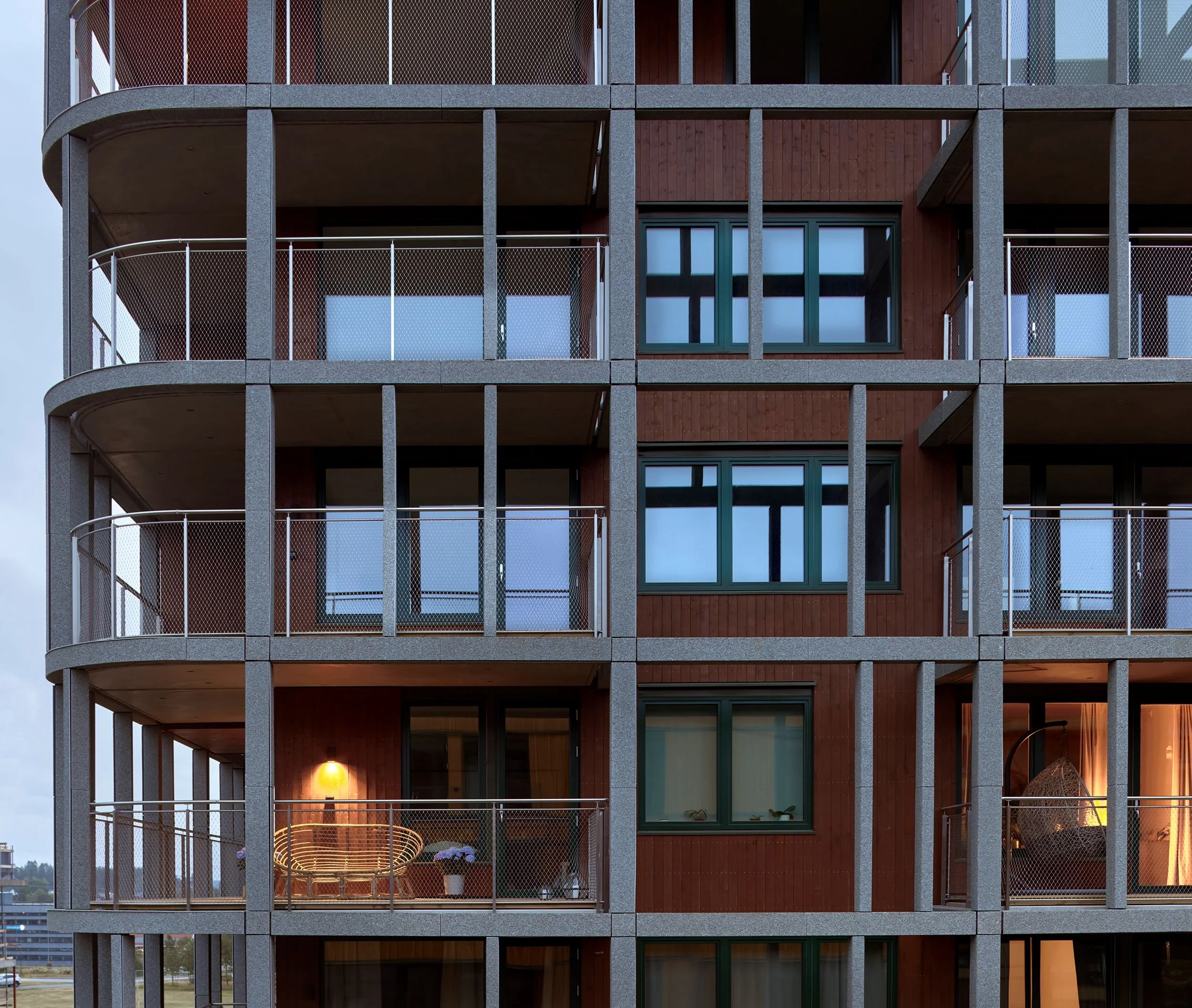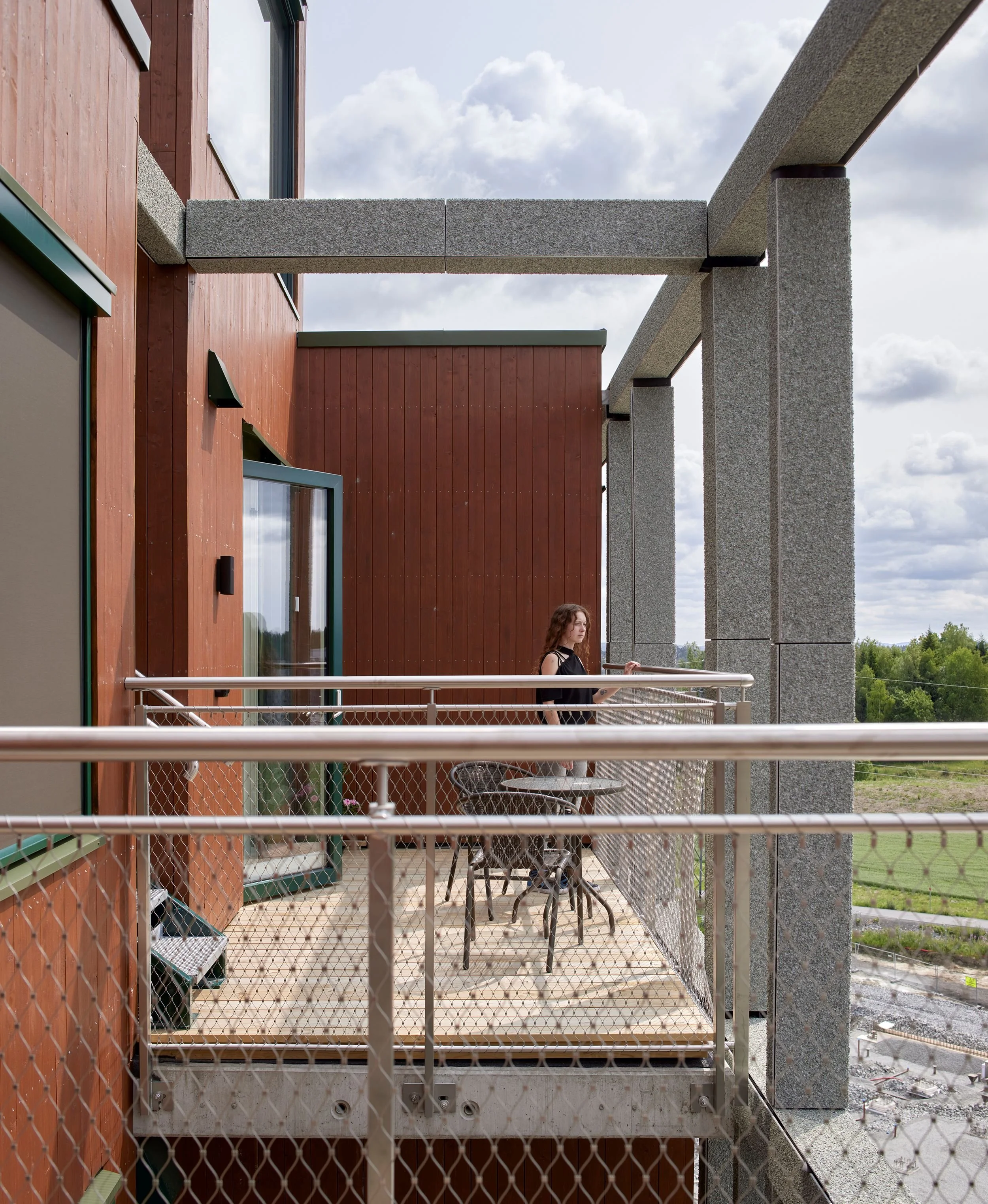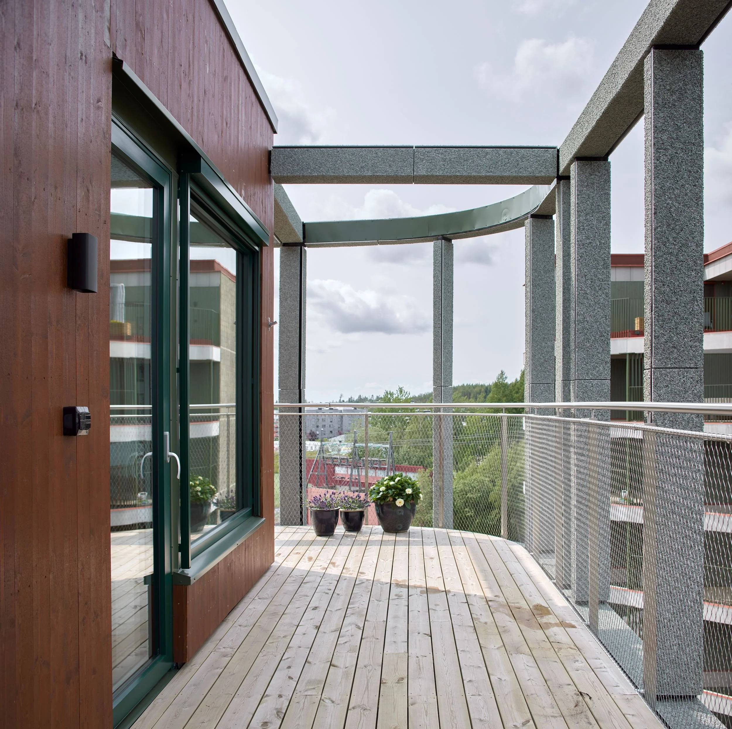 Even if you live on the seventh floor and are lucky enough to have a balcony, you do not want people to be able to look in. The grid has the unique quality of creating a screen against the outside world while at the same time preserving a special intimacy behind it. This feeling of intimacy is further enhanced as the wood on the exterior walls creates a warm and embracing atmosphere.