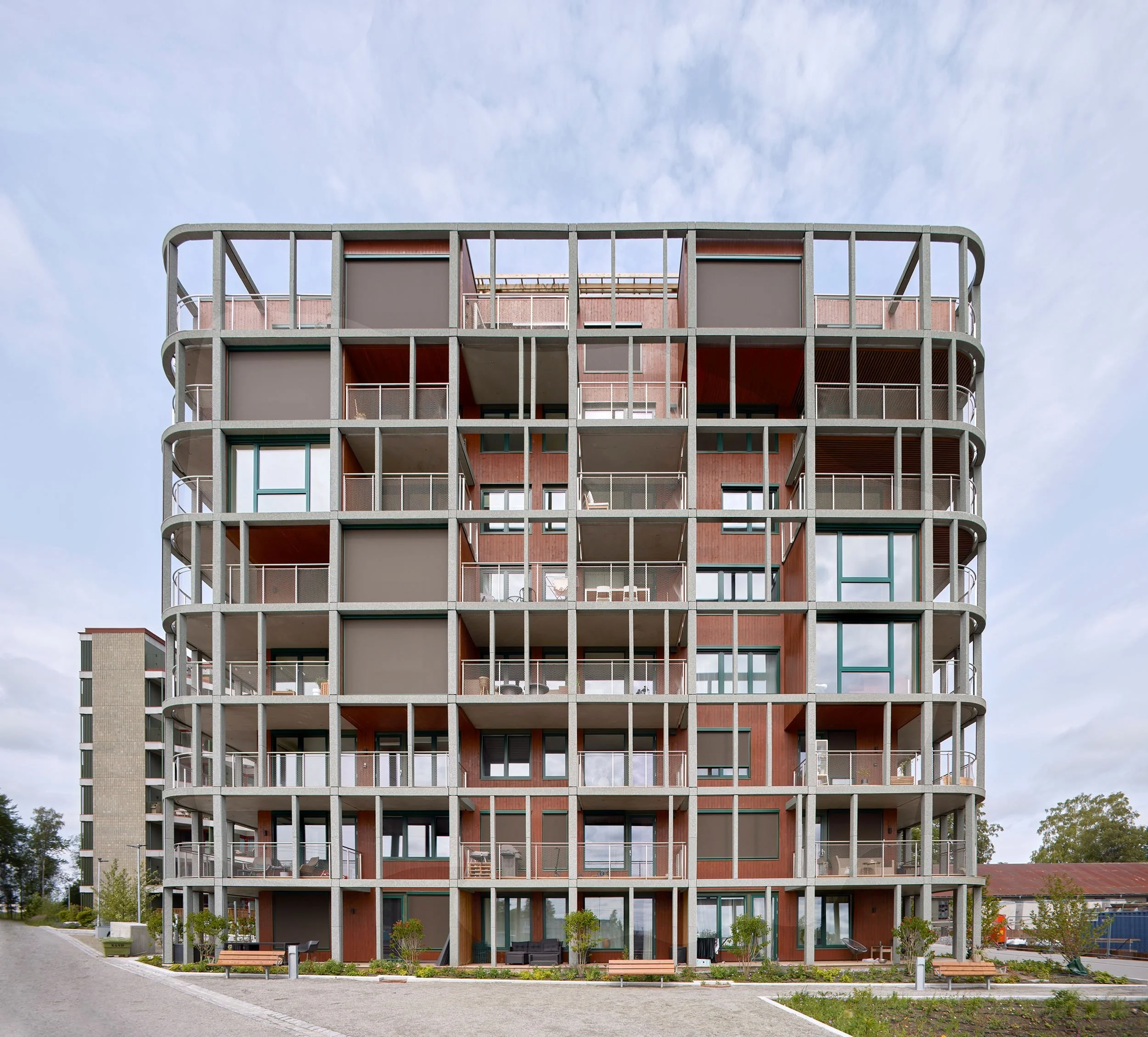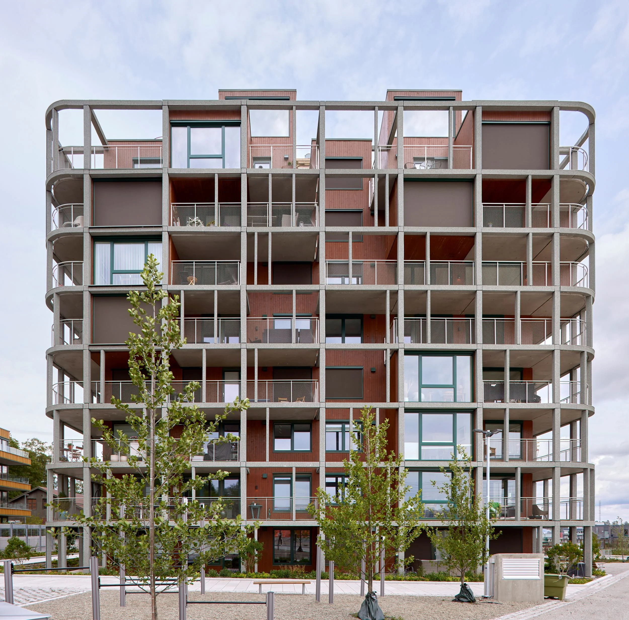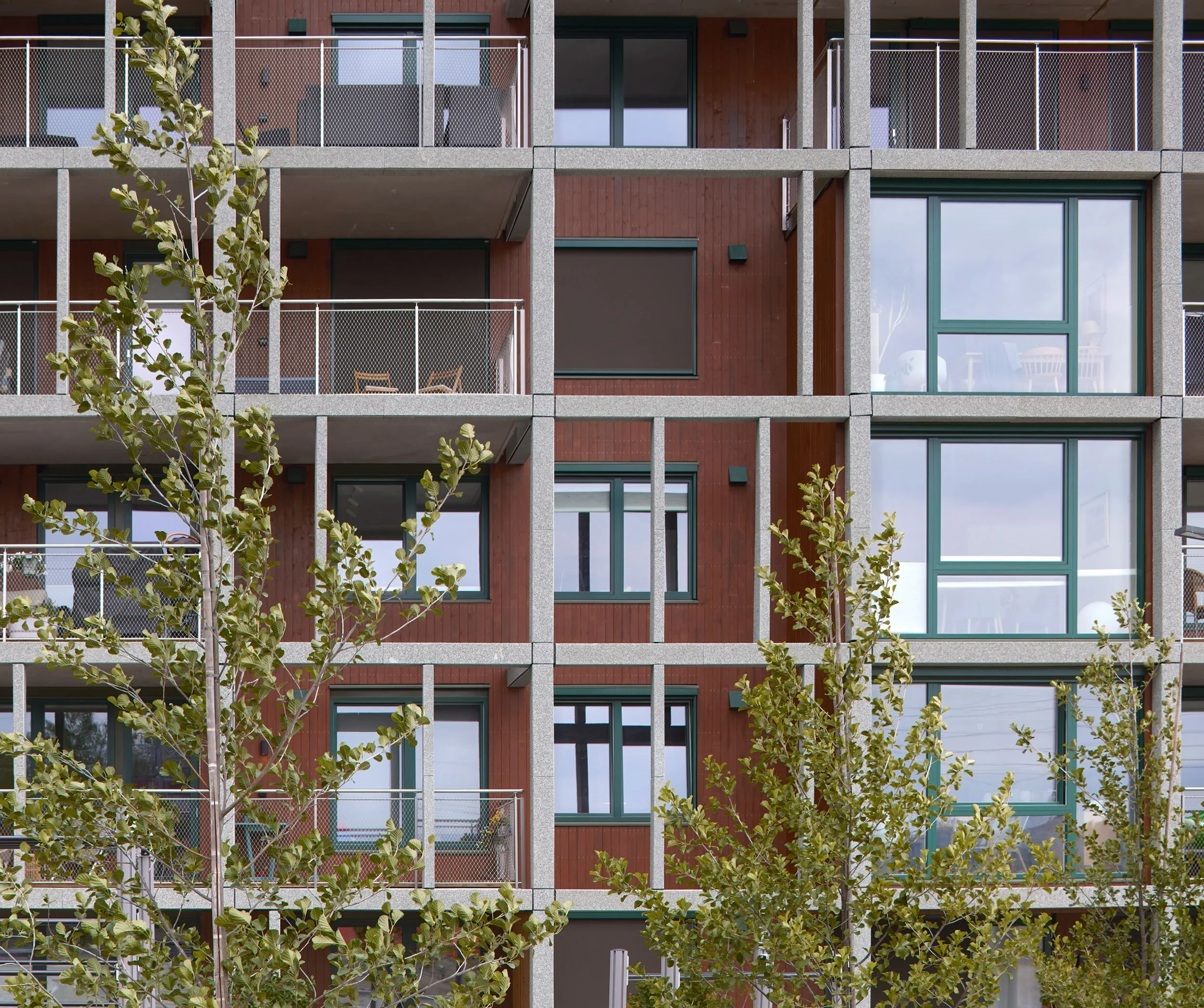 Even if you live on the seventh floor and are lucky enough to have a balcony, you do not want people to be able to look in. The grid has the unique quality of creating a screen against the outside world while at the same time preserving a special intimacy behind it. This feeling of intimacy is further enhanced as the wood on the exterior walls creates a warm and embracing atmosphere.