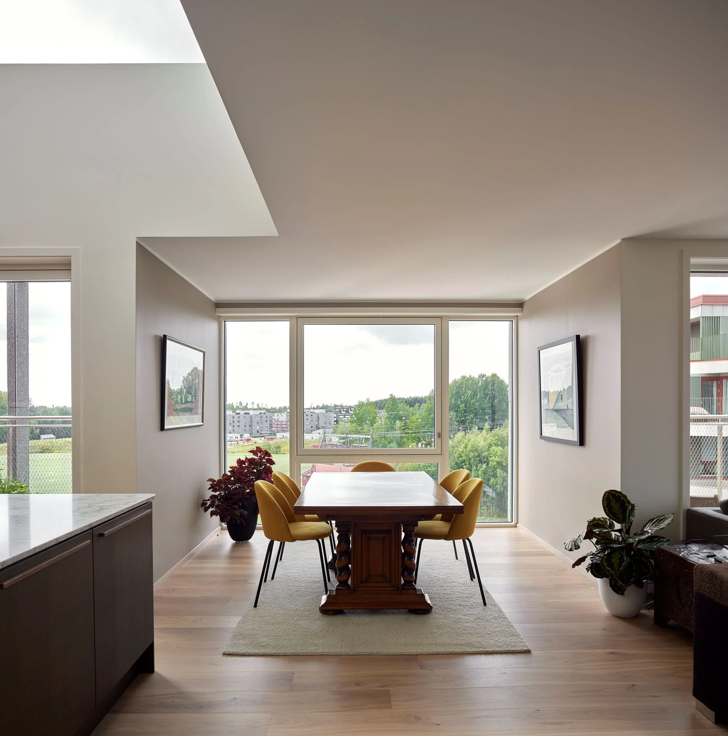 Today, open kitchen and living room areas dominate in new buildings. By putting in bay windows, we have manage to create several room-inside-a-room solutions. This means that the living spaces all have different zones where you can have the feeling of being alone even when you are not. The balconies gives a more spacious feel and make it seem as if the indoor space reaches all of the way to the framework.