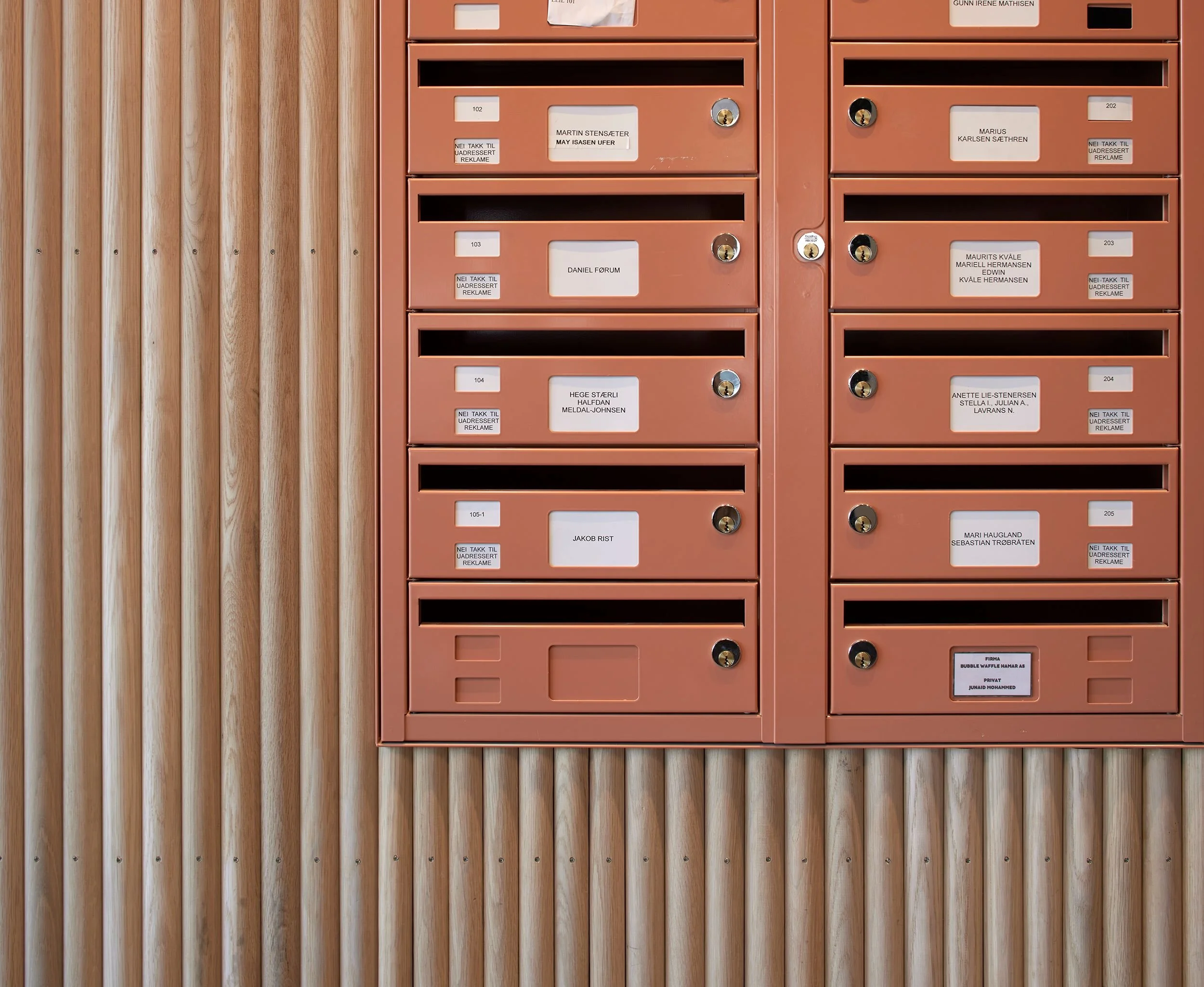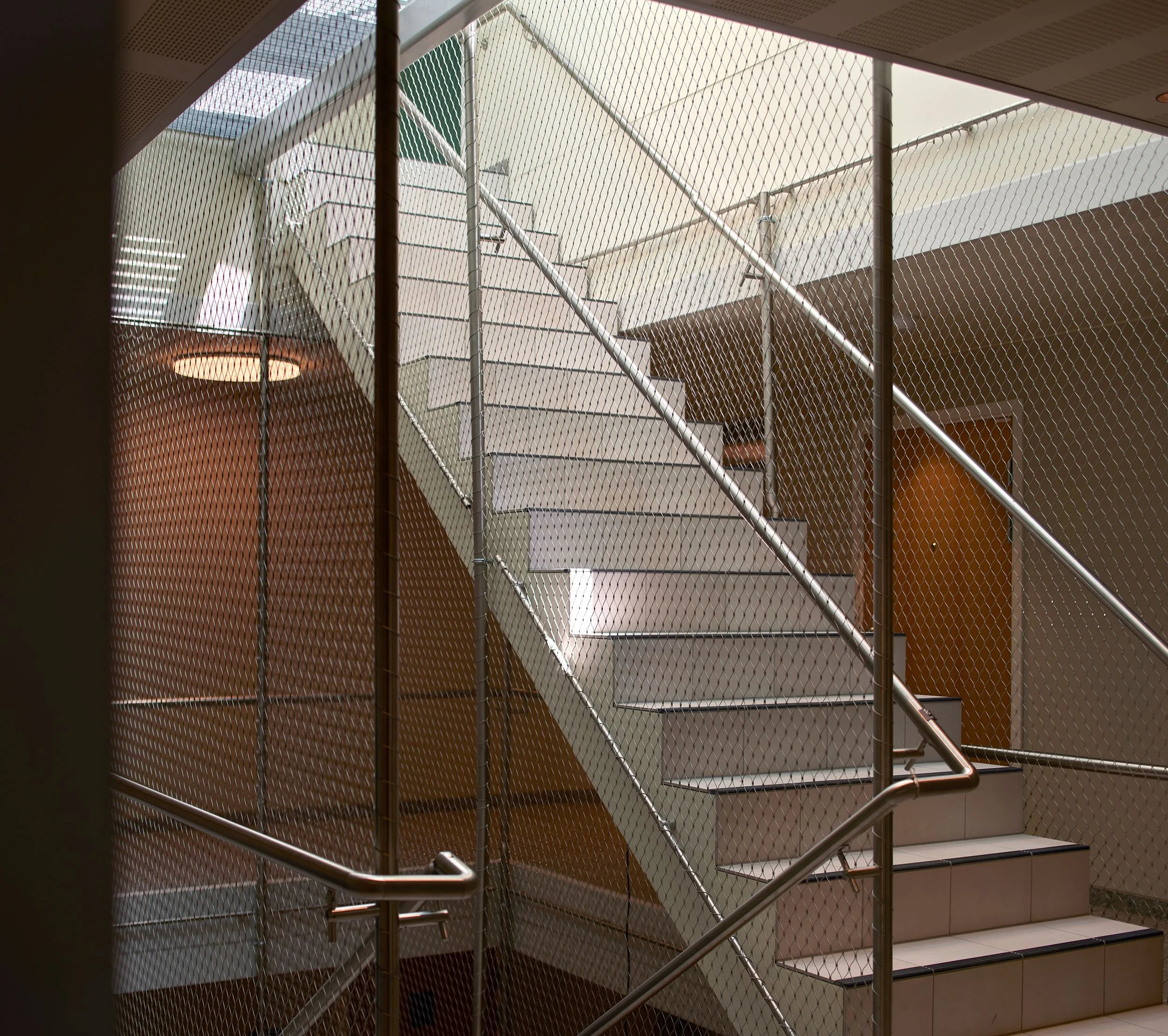 There was a desire to avoid the reflections that glass fences on balconies can give. Thanks to a quality-oriented client, using a railing of steel mesh of a particularly high quality was on the table. The meticulously interwoven steel mesh hangs down from the stainless steel pipes almost like hand knitted fishing nets. The elegant mesh lets the light and the view stream through and become part of the life on the inside. The same mesh railing has been used for the common pathways, where the curves from the corners are repeated in the transition from wall to roof.