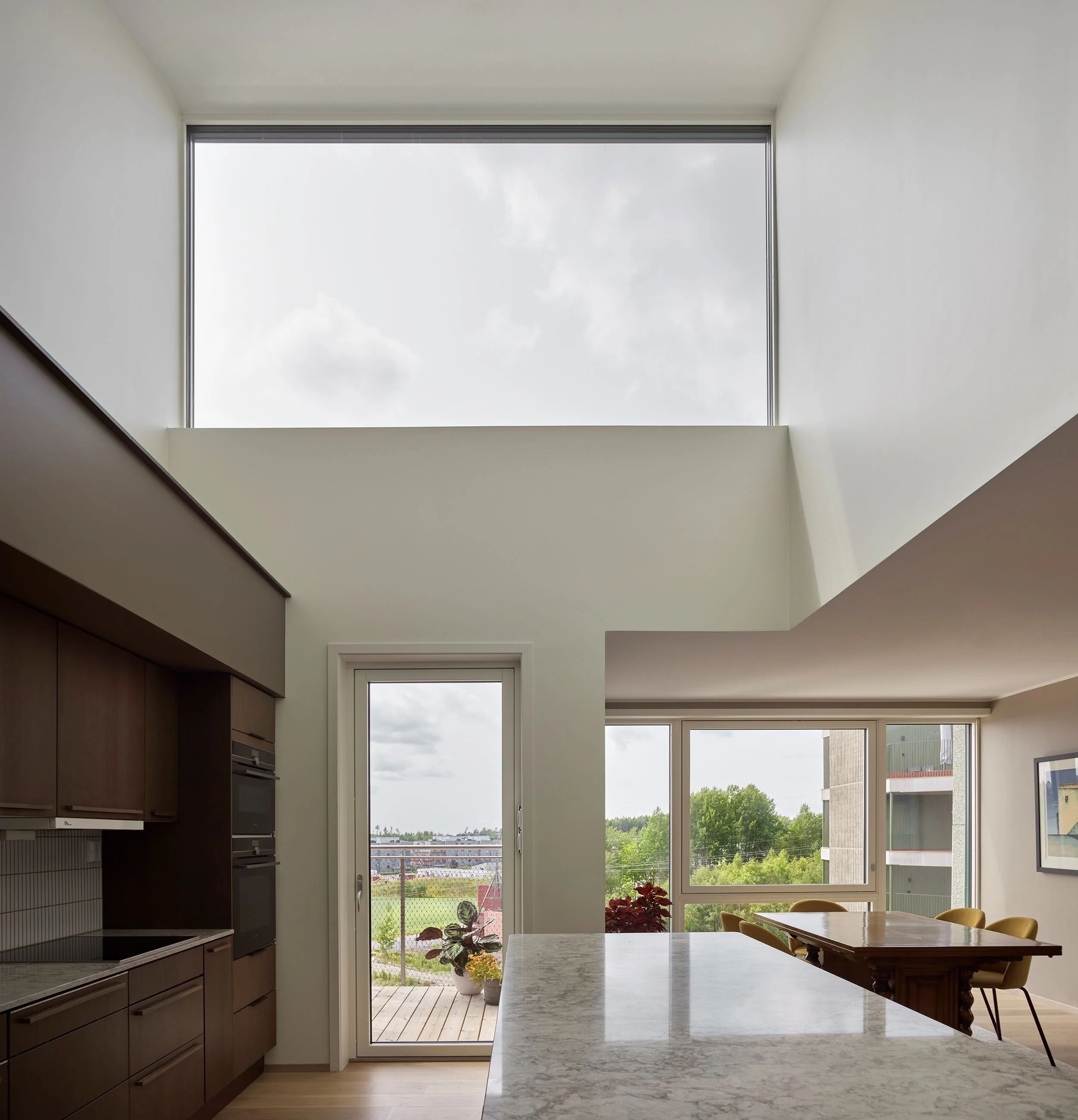 Four light shafts pop up as aesthetic markers on the roof. The building is oriented towards the south-east. Thorough calculations proved that it was possible to get the afternoon sun to shine down on the dinner table in four of the apartments by giving the light shafts a slanting roof. These slanting roofs also prevent snow from piling up on the overhangs.
