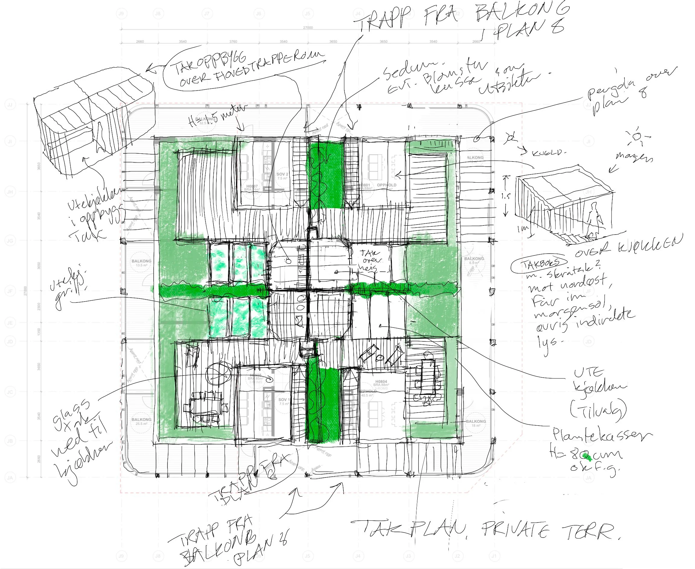 The four top floor apartment are all corner apartments with balconies and private roof terraces. Exterior staircases lead up to the roof terraces from the balconies, freeing up interior space that would otherwise be used for staircases. In addition, a more direct contact between the top floor apartments and their roof terraces is established. The light shaft also double up as zone dividers between the private roof terraces.