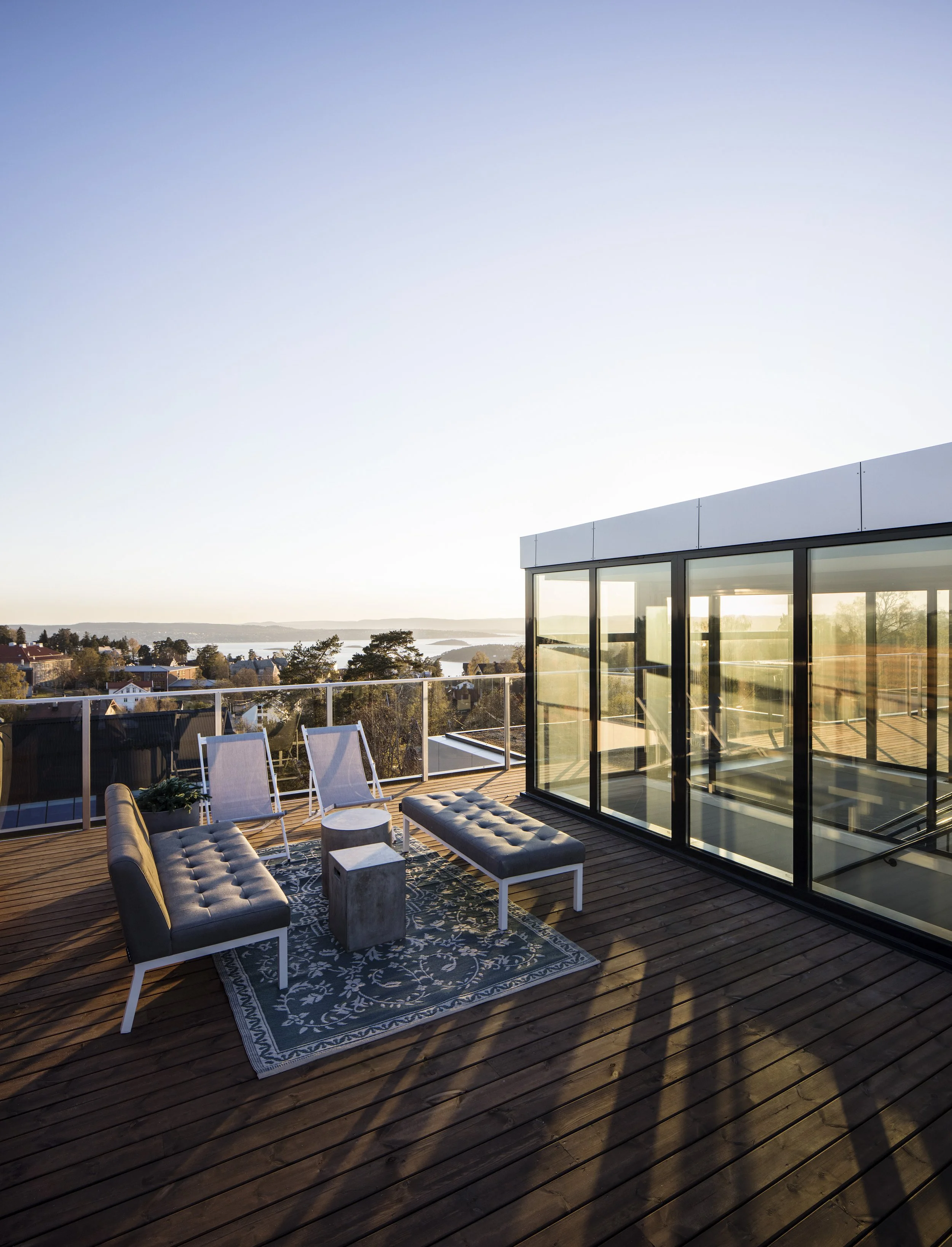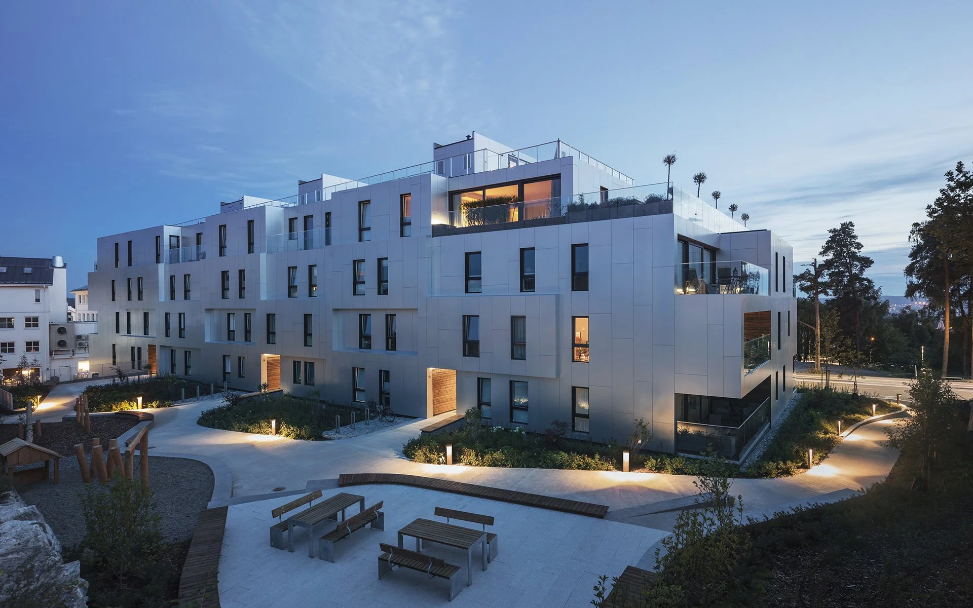 The plot is located on the Nordstrand plateau around 140 meters above sea level. The buildings is west-facing and has a view of the Oslofjord. Each apartment has its own balcony. The majority of the apartments are double aspect apartments with the sunlight coming in from two or three sides. A spacious open kitchen and living room with floor to ceiling glass sliding doors that let the sunlight through, is placed on the front side.