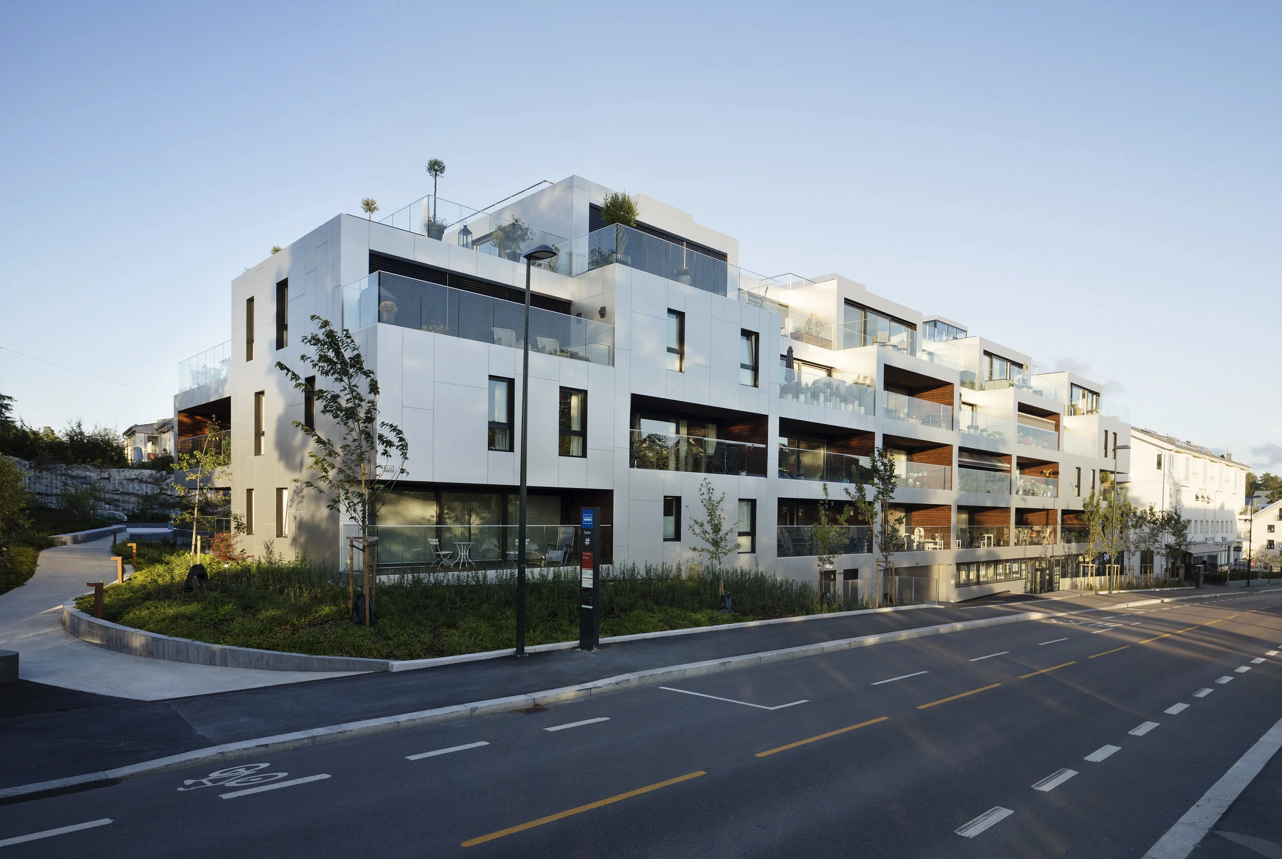 Sæterkrysset stood out as a natural choice for densification following the municipal densification initiatives from 2004 and on. A-lab was hired by Solon Eiendom AS in 2012 to develop two plots of a total of 3300 m2 that were located in the transition zone between the residential area and the office buildings around the intersection.