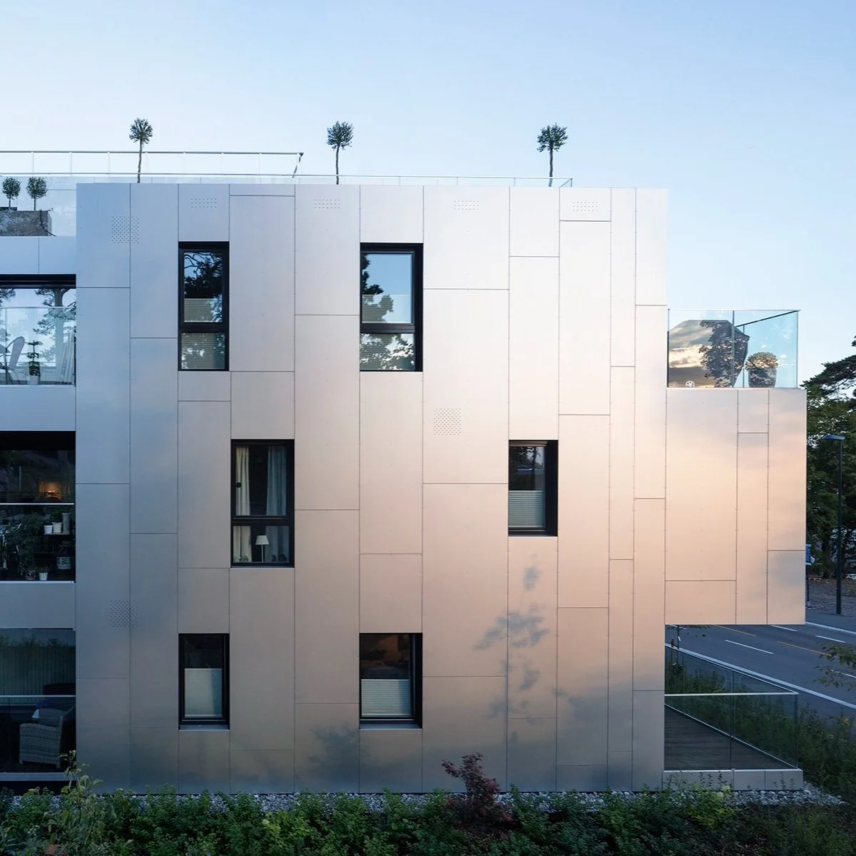 On the façade, aluminum sheets with a brushed surface have been used. This material reflects the shifting light and shadow conditions and work as a kind of invisibility cloak at times. In wintertime the freezing sky can cover the entire building in a white suit, while a late summer evening can make it look fiery red as the sun sets. As a warm contrast to the aluminum, wood cladding has been used to frame the balconies and the entrance areas.