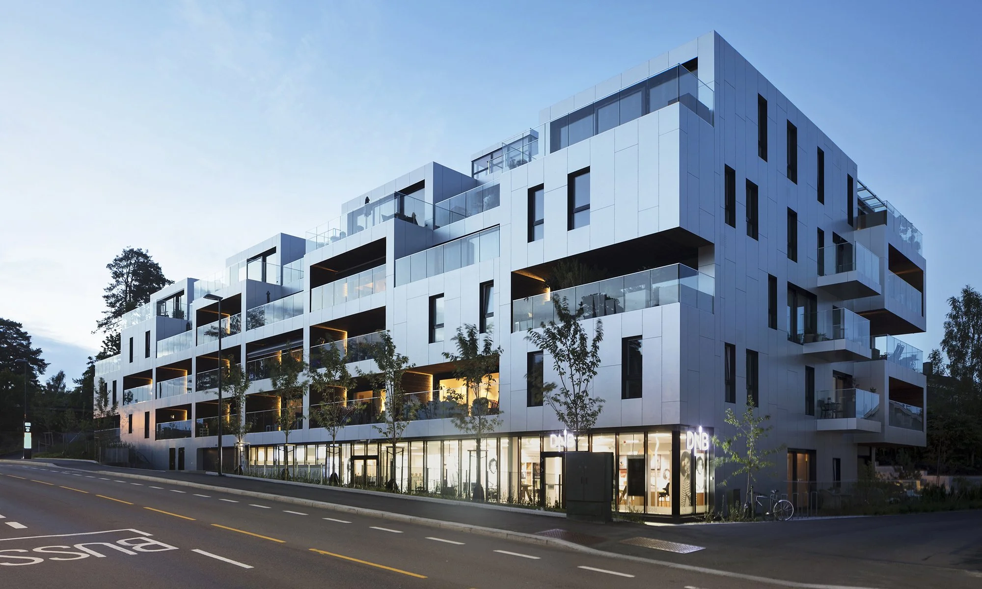 The desire was to dismantle the volume of the building in order to scale down its look and presence. Receding and protruding vertical layers create a cubistic variation in the façade facing Nordstrandveien to the west. Each apartment has a private balcony with a westward view. The balconies are not placed onto the façade, but rather cut out of the main volume, further preventing the living rooms to be visible from the outside.