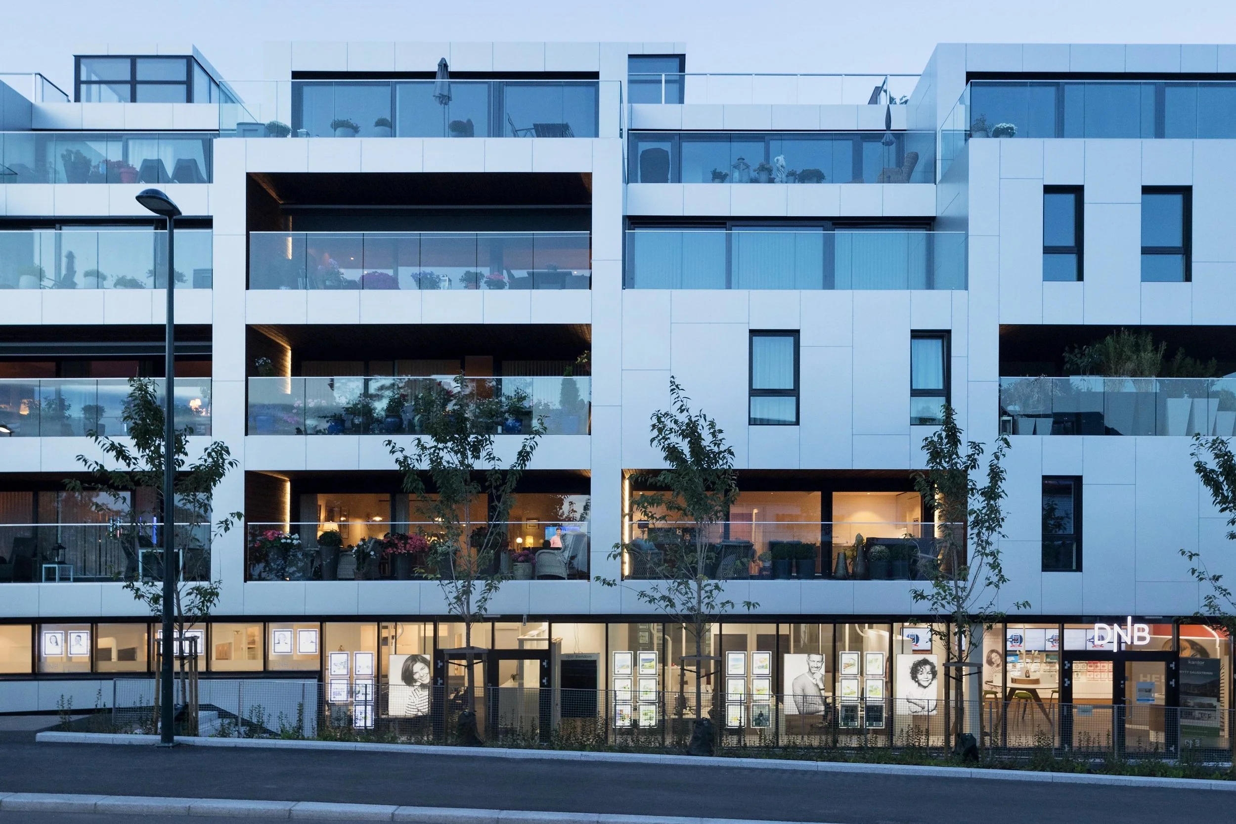 Imagine a large rectangular box, and imagine what happens when you start cutting out volumes of this box. All of a sudden it is no longer a matter of one massive element, but rather a structure with steps and protrusions. Each apartment gets a separate balcony, large windows let the sunlight stream inside, and the bedrooms enjoy the silence from the screened backside. As the seasons change, there is a play of light and shadows on the aluminum plated façade. For Sæterkrysset, this building is an elegant bridge-builder between the single-family homes and the office buildings around the intersection.