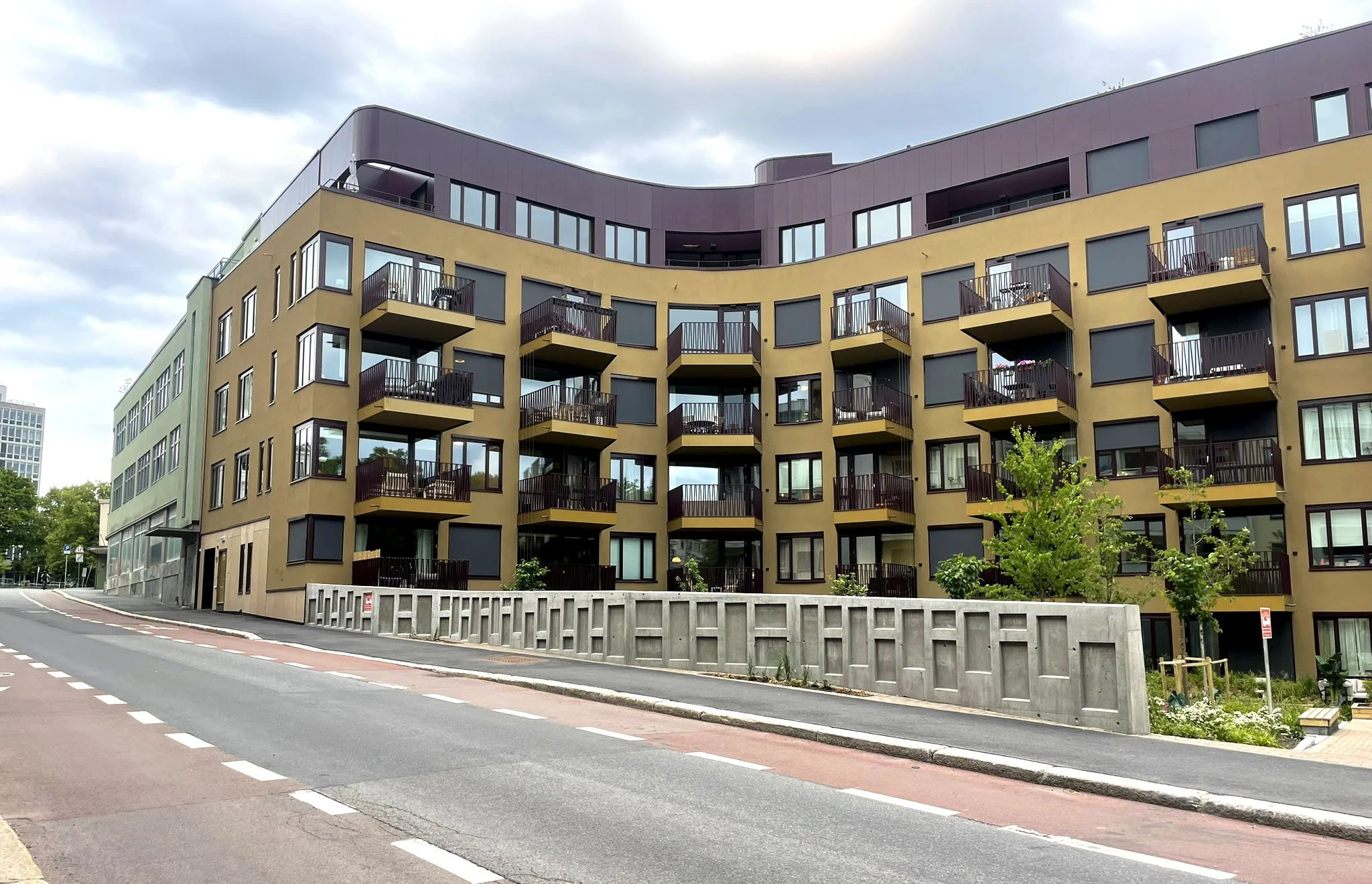 This residential housing project replaced a five-floor office building, with somewhat of the same footprint, only with an arched façade towards east and west. This expression is a nod to the neighboring building as it simultaneously improves the sun condition and reduces visibility from onlookers in.