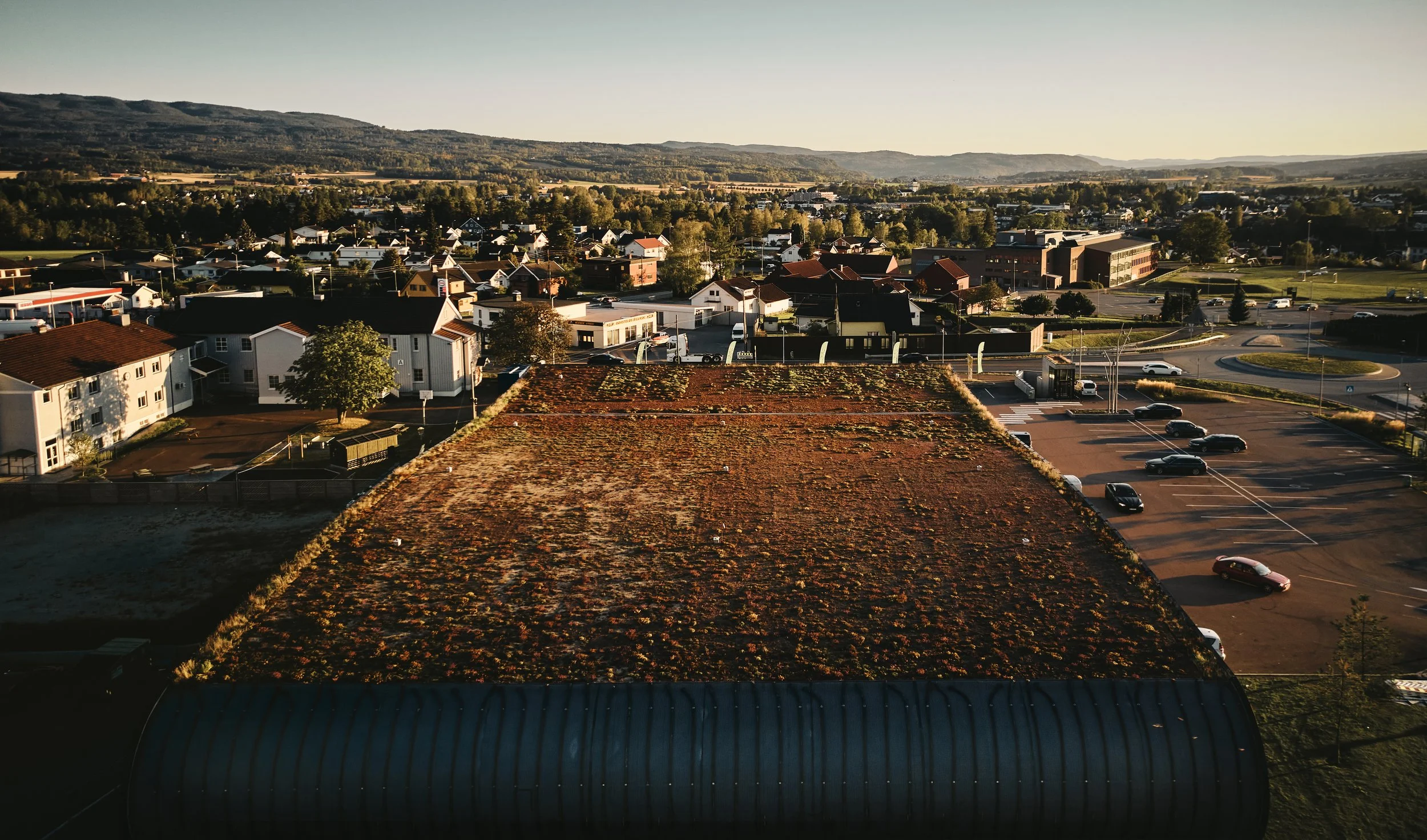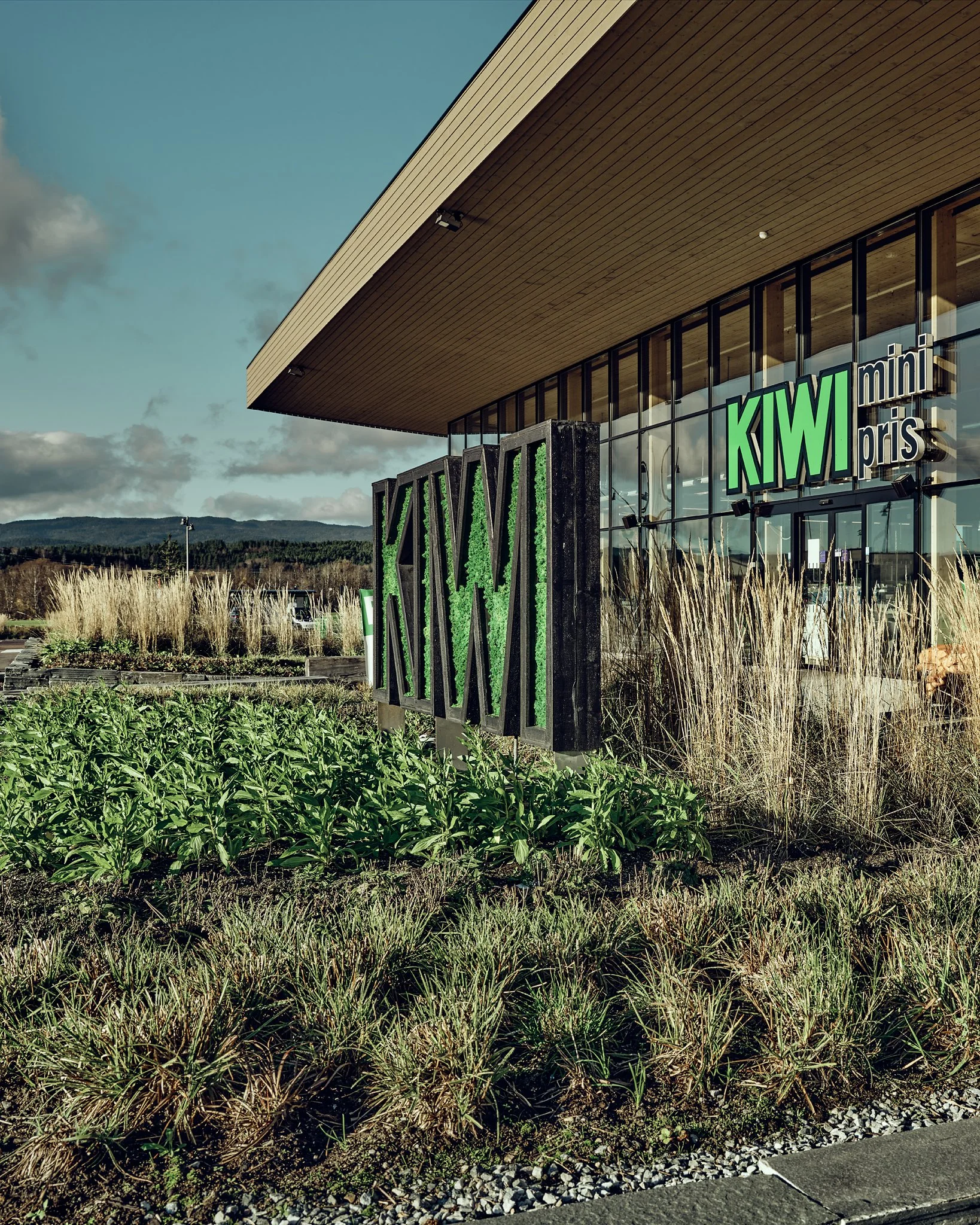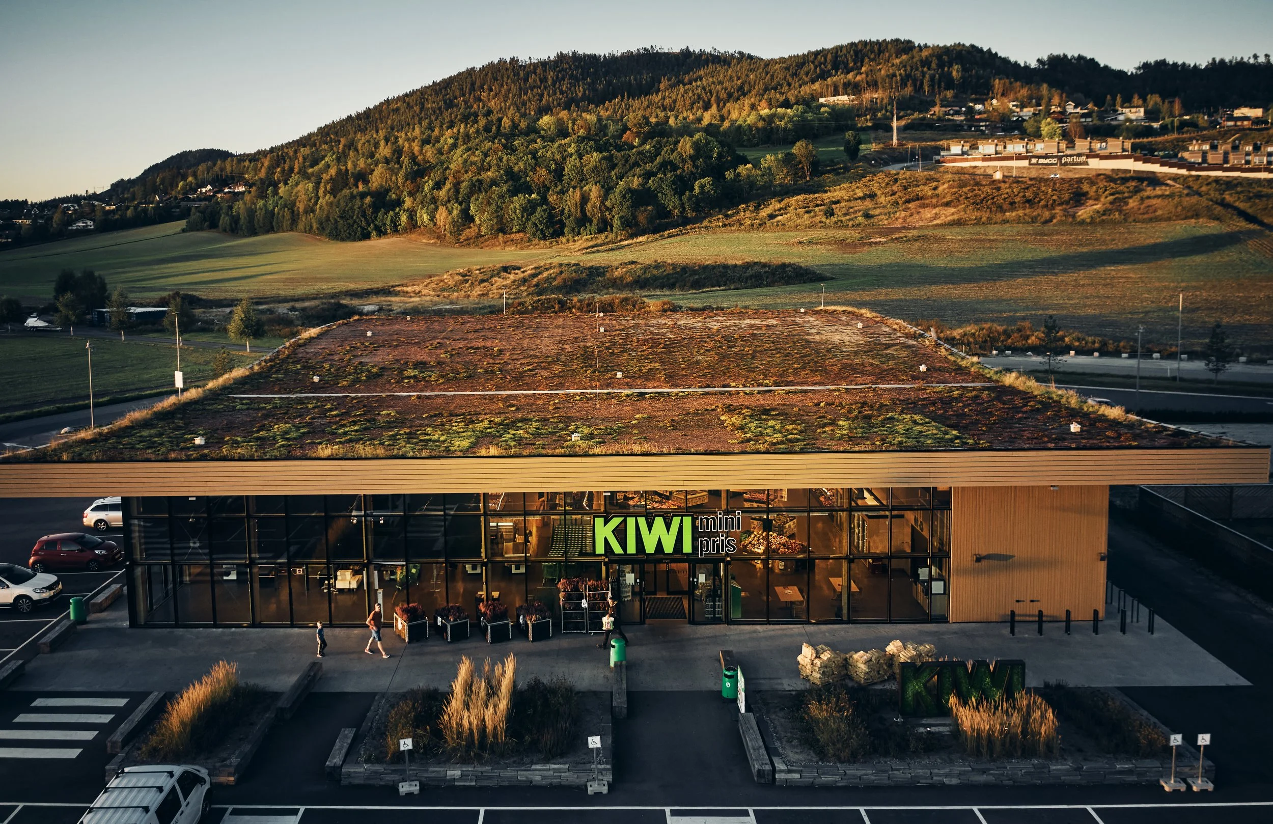 A 2200 square meter big roof lies like a wave over a KIWI grocery store in Hokksund. Planted with sedum and moss, and fitted with 15 bumblebee hives, the roof acts as a biotope for endangered plant and insect species in the local area, and it produces fresh air. Environmentally friendly and recyclable materials means that the whole building can be disassembled and repurposed elsewhere. The climate gas emissions have been reduced by 60% compared to a normal KIWI store, and the energy consumption is halved.