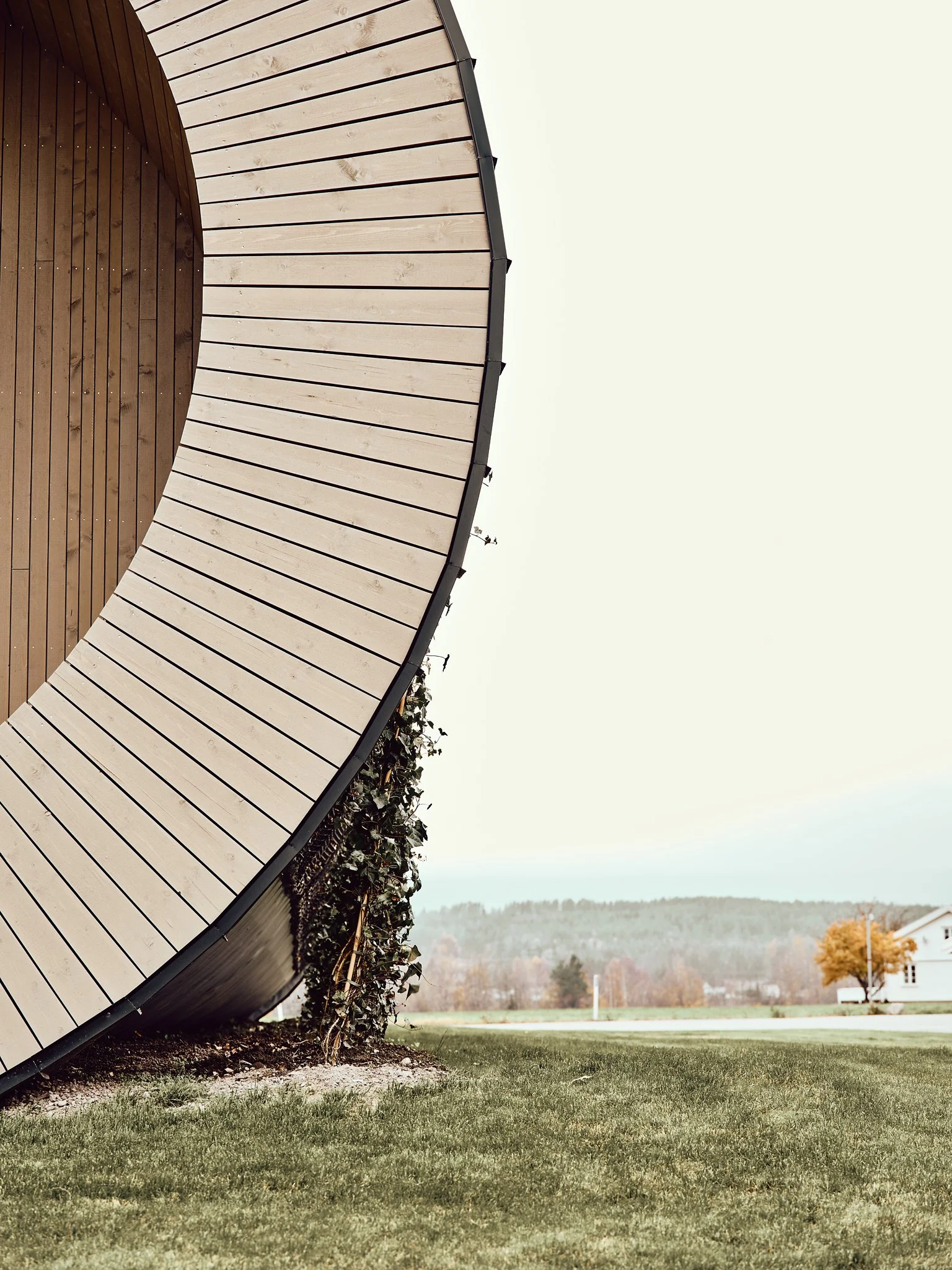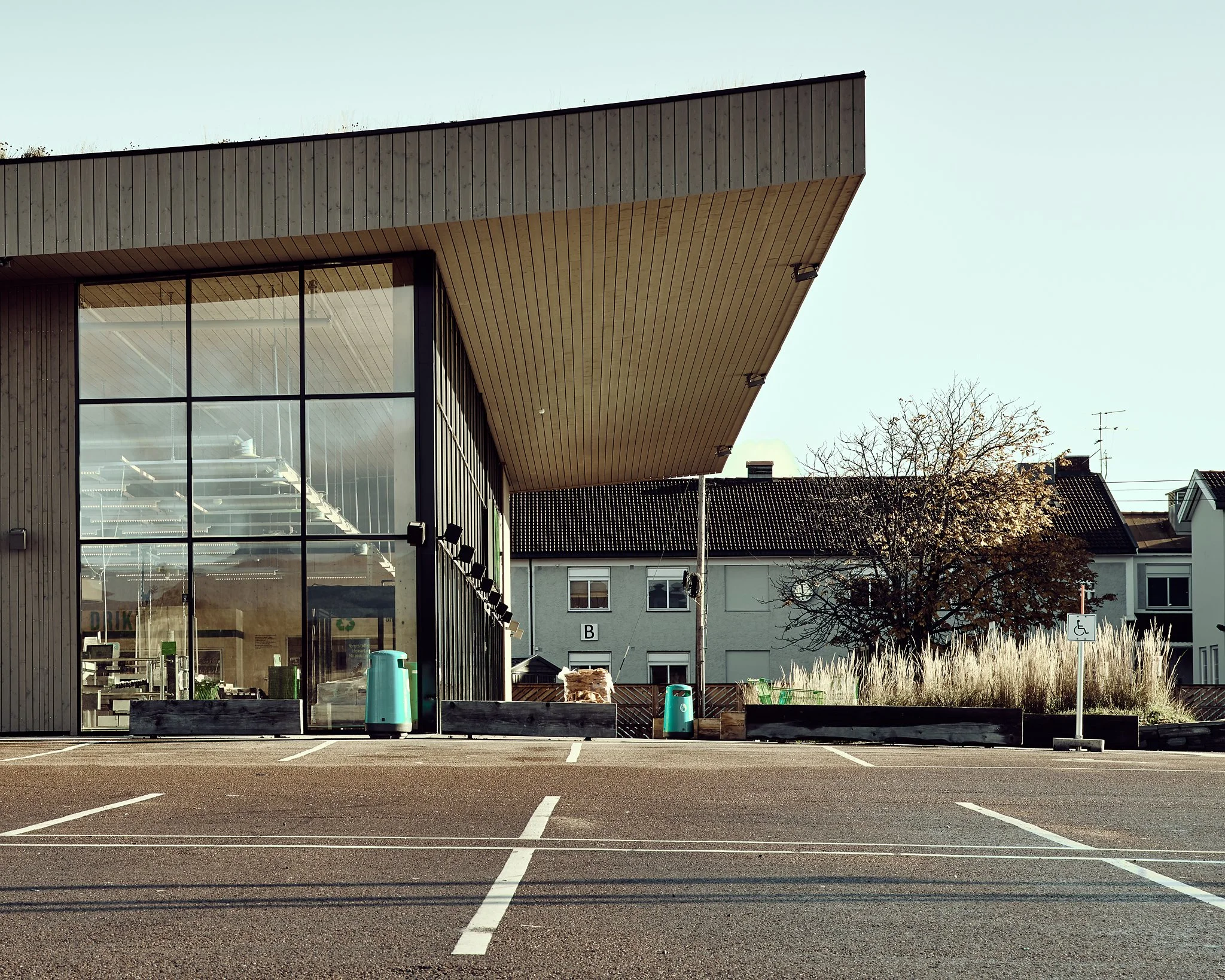 «Grønn i svingene» is an example of how supermarket architecture can opt for wood, instead of metal, which has been the go-to choice. Wooden roof constructions are a new design type in Norway that are made viable through the use of laminated wooden sheets as well as girders and supports in laminated wood. The laminated wooden sheets can be bent much like plywood, and this property made the organic rounding of the backside of the building possible.