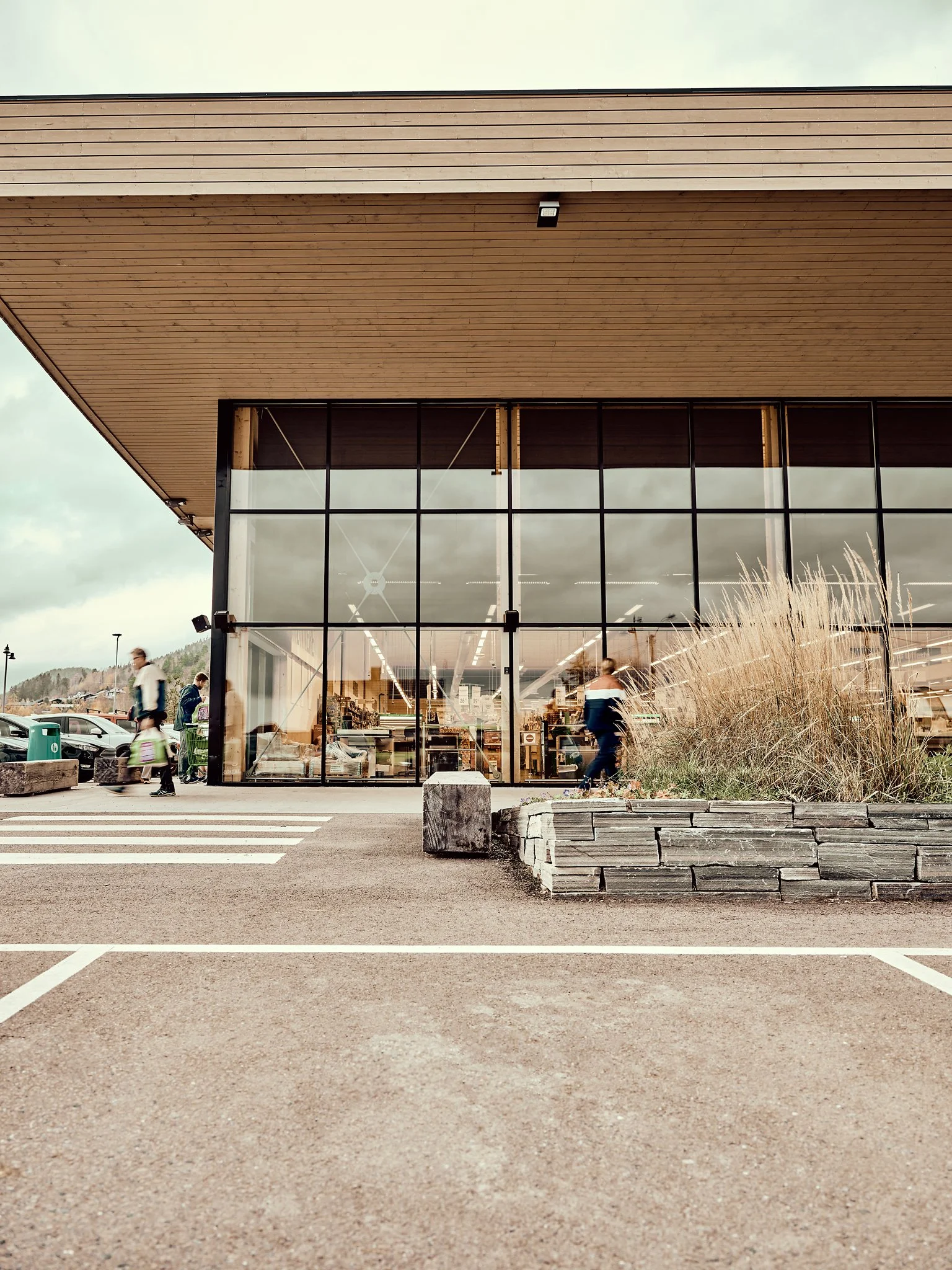 The varied planting on the roof helps creating a biological diversity in the project. In addition, 15 bee hives has been placed on the roof to increase the chances of local pollination. Even in Hokksund, a town surrounded by huge green areas, several insect species are endangered. In addition, rainwater management such as rainwater-detaining, deep flower beds on the roof and rain gardens on the ground are countermeasures to the increased frequency of extreme weather. The use of LED lighting is universal, and outside of the store, there are of course charging station for both e-cars and e-bikes.